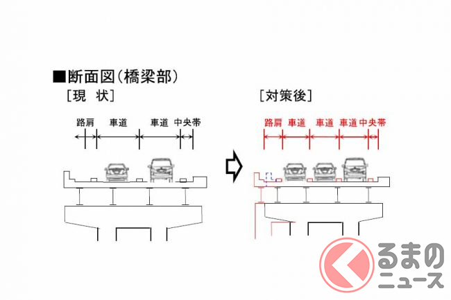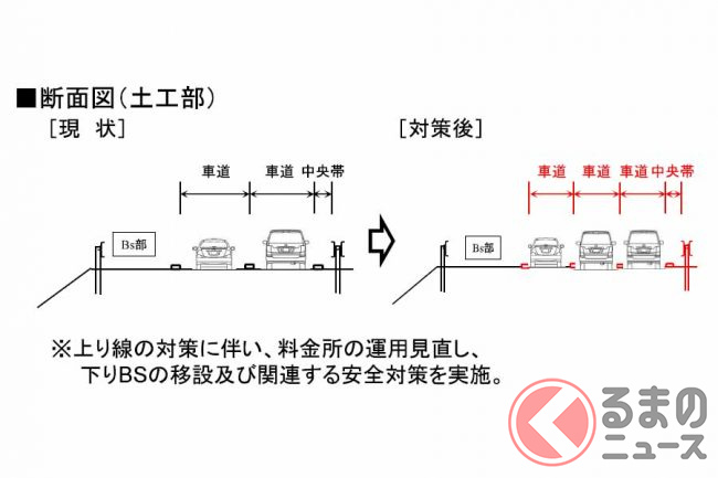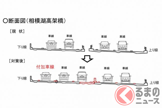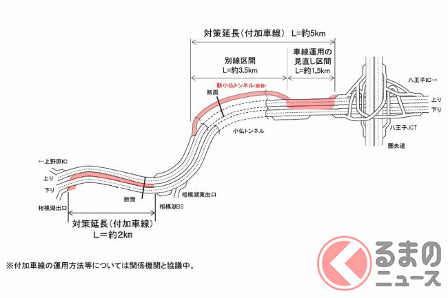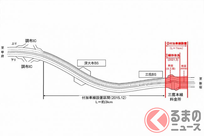 この区間は4車線(片側2車線)ですが交通量が多く、通勤時間帯や週末を中心に渋滞が発生しています。その中で現在、対策が進められているのは、上りの小仏トンネルと三鷹バス停付近、そして下りの相模湖付近です。