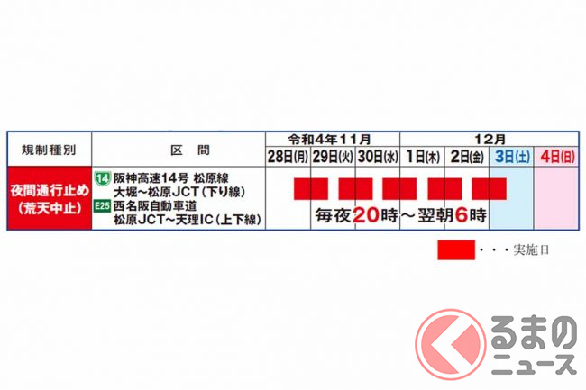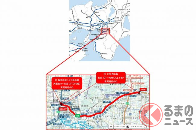 補修・保全工事に伴い、西名阪道の全線で5夜連続の通行止めが実施されます。阪神高速14号松原線の一部区間も影響が出ます。