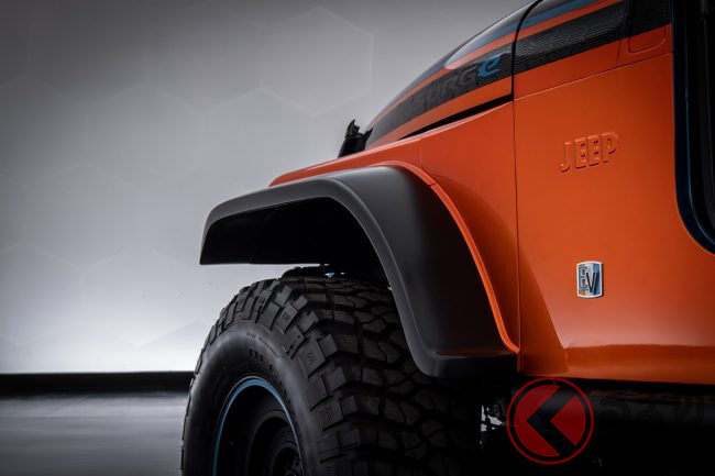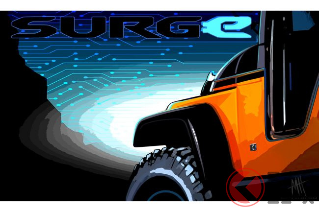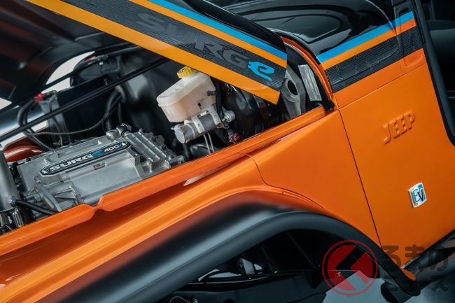 ジープ CJ サージ コンセプトはクラシカルな4WDの外観を生かしつつ、出力200kW(約272馬力)の電気駆動モジュールを搭載したEV(電気自動車)として登場。2速トランスファーケースが組み合わされます。