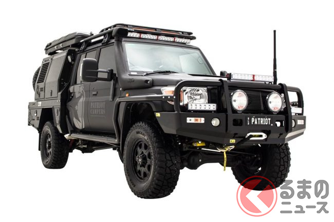 真っ黒な外観で「ブラックトラック」の愛称を持つスーパーツアラーは、「ランクル70シリーズ(GLX)」をベースに11.8インチ(約300mm)フレームを延長。パトリオット・キャンパーズが設計したボディを搭載しました。