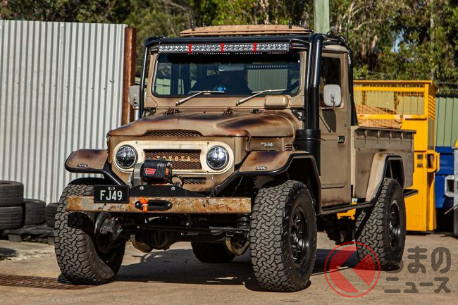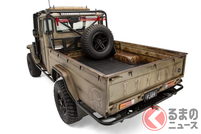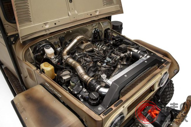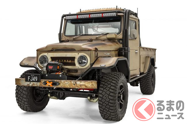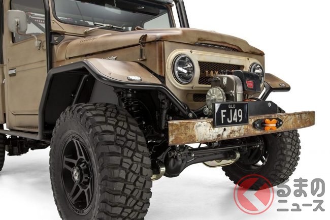 「FJ49」は1997年式の「ランクル40(FJ45)」をベースとし、ランクル79の4.5リッターV型8気筒ディーゼルターボエンジンやトランスミッション、エアコン、デフ、スプリングなどを載せ換えたモデル。レトロな外観でありながら、快適性や信頼性を実現しました。