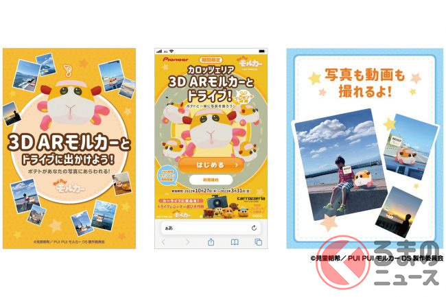 今回のキャンペーンはそのコラボ企画の一環として実施されるもので、全国のカー用品店に設置してある告知ポスターのQRコードから専用サイトにアクセスし簡単なアンケートに答えると、いつでもどこでもモルカーと一緒に写真や動画を撮影できる「3D ARモルカー」がプレゼントされるという内容です。