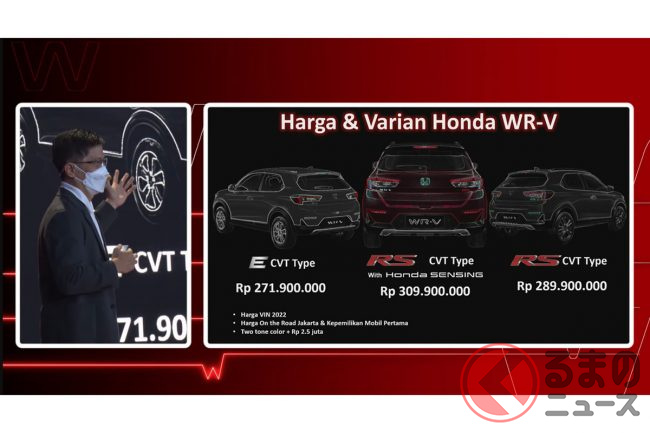 新型WR-Vは「E」「RS」「RS ホンダセンシング」の3グレードを設定。価格は2億7190万ルピアから3億990万ルピア(約255万円から約291万円)です。