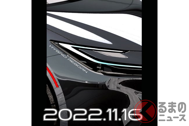 また、ティザーサイトの公開約4時間半後にトヨタの公式Twitterでは、フロント周りと思われる画像を投稿。特徴的な「コ」の字型のヘッドライト周りに「HYBRID REBORN」の文字を記していることから、ハイブリッド車として登場することが予想できます。