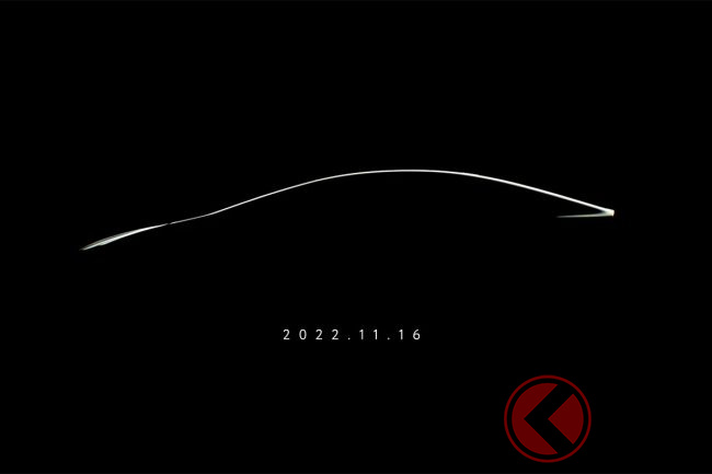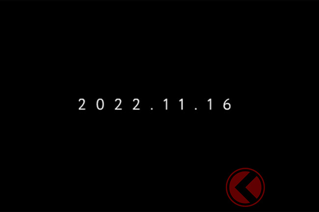 画像では、黒の背景に新型車のシルエットのような「線」が映し出されており、その下には「2022.11.16」の文字が並べられています。