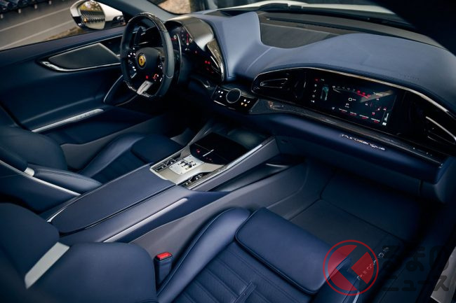 インテリアはエレガントでスポーティなラウンジのようなデザイン。前席はSF90ストラダーレからインスピレーションを受けたという、運転席と助手席が対照的な形状になっているのが特徴。助手席側に配置された10.2インチのディスプレイには、助手席の人が運転に必要な情報をドライバーに提供可能です。