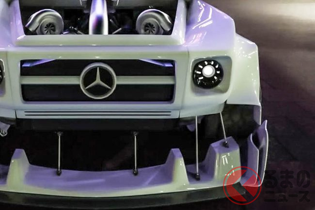 さらにフロントバンパーはボディから切り離され、吊り下げられたアンダースポイラーに換装。ボンネットも外され、ツインターボ化されているように見えるエンジンがむき出しになっています。Gクラスの丸目のヘッドライトと相まって、まるでドクロのような印象です。