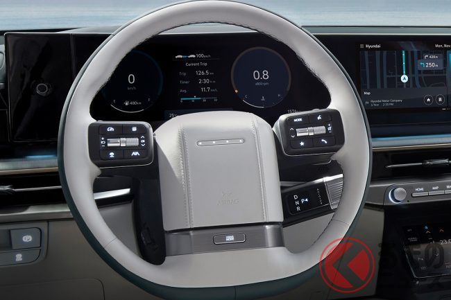 ステアリングは初代グレンジャーをオマージュしたといい、6時方向の太いスポークを中心として左右にスイッチ類が配置されたクラシカルなデザインで、ステアリング右下にシフトレバーが配置されています。