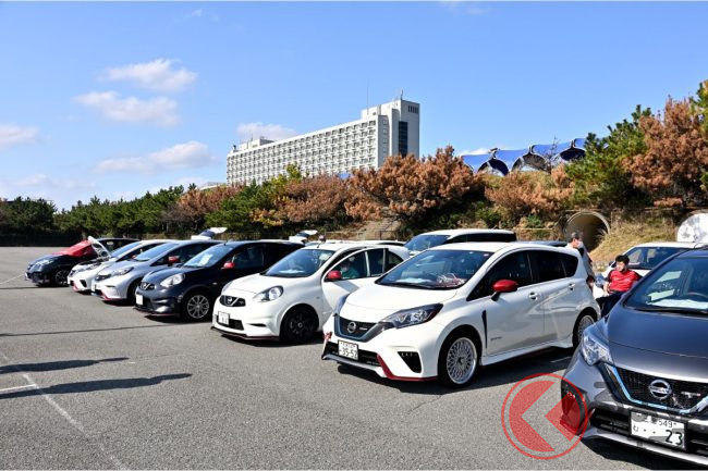 ノート70台を筆頭にマーチ53台、セレナ50台、エルグランド、エクストレイル、シルビア、オーラ、リーフ、といった多種多様な車両が集合しました。