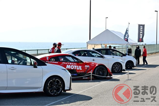 NMCとなって初めての里帰りミーティングということで、オーテックだけでなく、NISMOが手がけるロードカーも参加可能となり、ノート、マーチ、セレナ、リーフなどのNISMOバージョンの車両も多く集合しています。