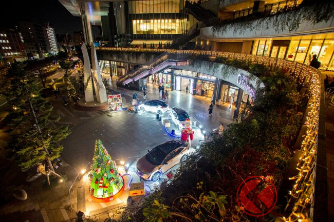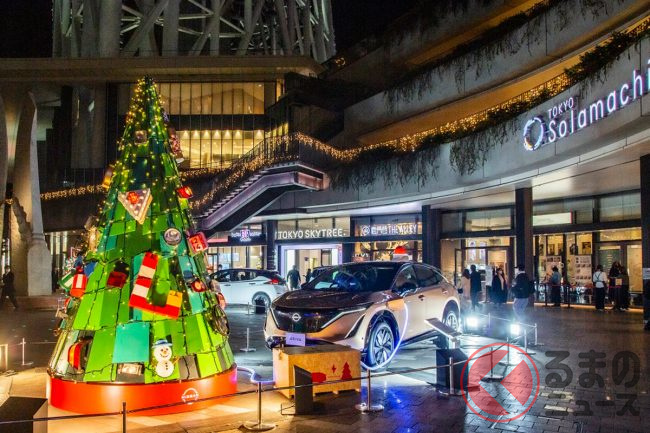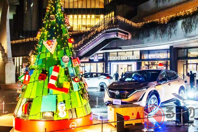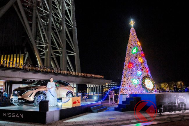“もみの木”などを「サクラ/アリア/リーフ」で光らせる! 日産「最新EV」が東京スカイツリーのクリスマスイルミに電力供給