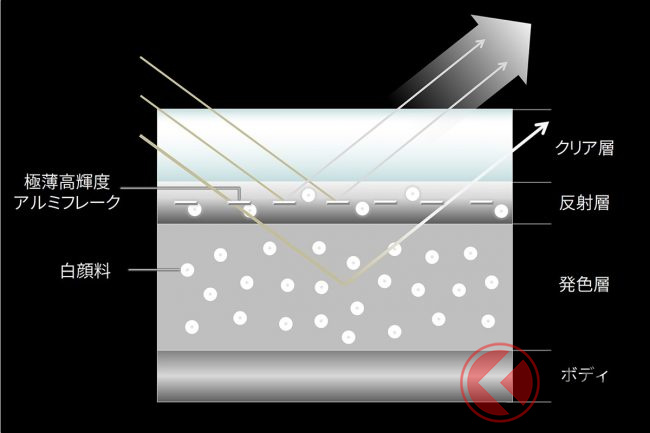 反射・吸収層には、匠塗第3弾の「ロジウムホワイトプレミアムメタリック」に採用した、アルミフレークをより平滑かつ等間隔に並べる技術と、第2弾の「マシーングレープレミアムメタリック」でシェード部の表現に用いた漆黒顔料を改良して採用しています。