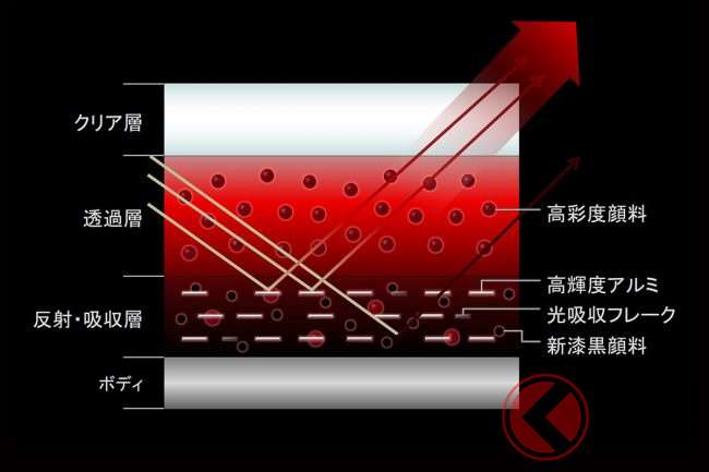 透過層にはソウルレッドクリスタルメタリック同様の、人間が最も赤みを感じる高彩度顔料を使用。