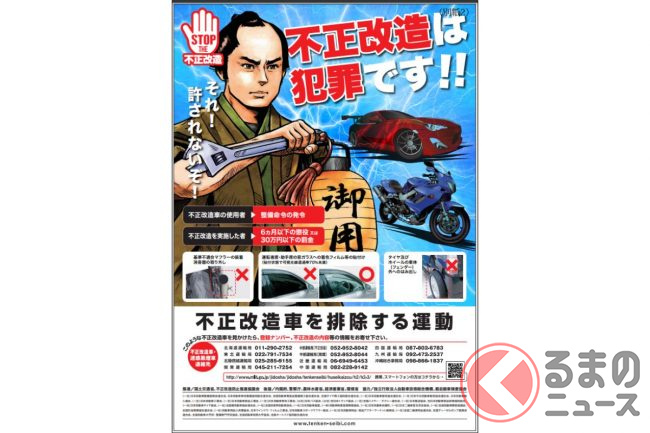 各都道府県運輸局への情報提供窓口を設置しており、不正改造車を見かけた場合に「車両のナンバー」「不正改造の内容」についての通報が呼びかけられています。