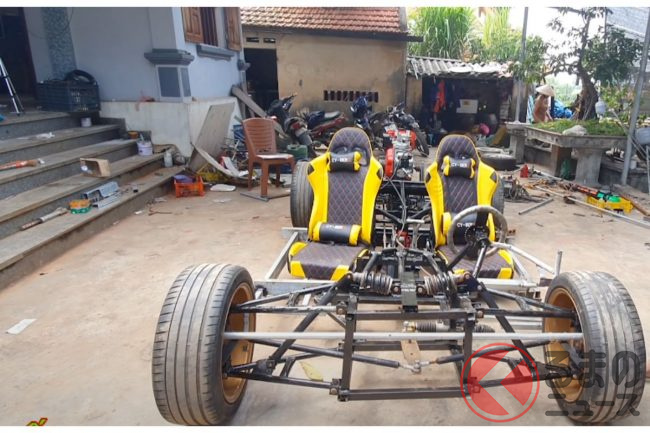 まずはシャシーを金属パイプで組み、ステアリングやサスペンション、ホイール、ギアボックス、エンジン(300cc)などを装着します。