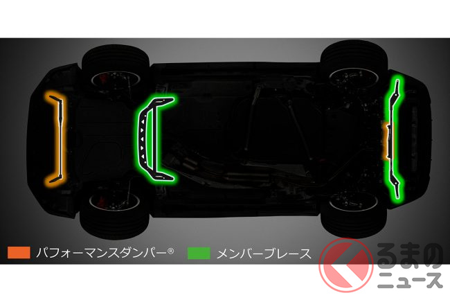 また、「パフォーマンスダンパー EX Plus」はボディフロアの補強パーツであるメンバーブレースと、ヤマハの技術「パフォーマンスダンパー」を組み合わせたパーツで、走行中の微振動や騒音を解消し、快適性とコーナリング時の操縦安定性を高めるアイテムです。