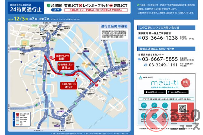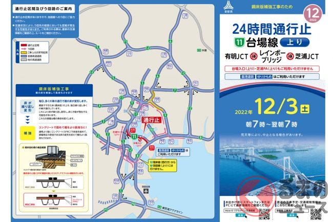 首都高の11号台場線下りが2022年12月3日(土)朝7時から丸一日通行止めとなり、う回を呼びかけています。