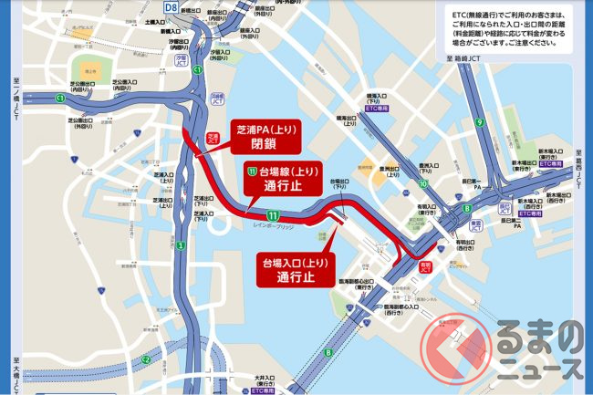 この工事にともない、工事区間の台場入口(上り)と芝浦PAは閉鎖となります。