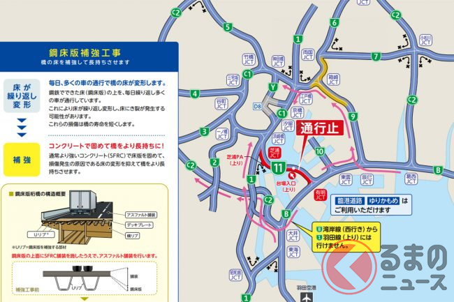 工事区間と並走するレインボーブリッジの一般道路部(臨港道路)と、並走する新交通システムゆりかもめは通常通り利用可能です。