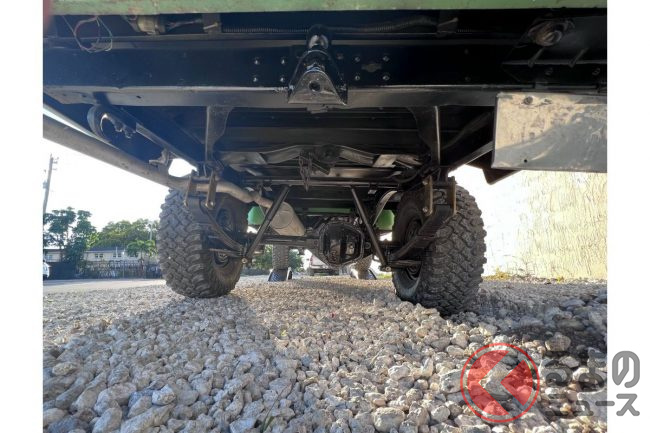 外装はグリーンに塗られ、内装はグレー。15インチのスチールホイールやウインチ付きのカスタムフロントバンパー、エアコンとヒーター、Bluetooth対応のオーディオシステムが換装・追加されています。
