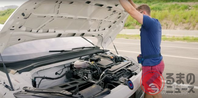 一方、巨大になったリアハッチはとても重く、開けるのも困難なようです。またフロントボンネットを開けるとエンジンが左寄せ搭載されていることが確認できますが、このクルマは、エンジンに隣接する左一輪のみを駆動輪としているとのことです。