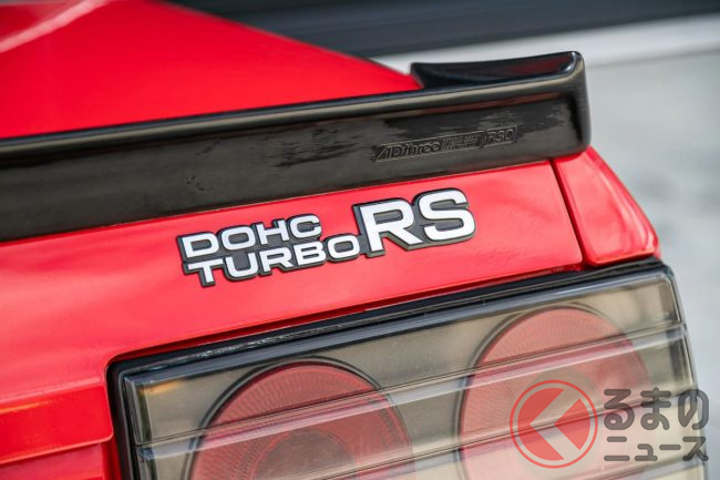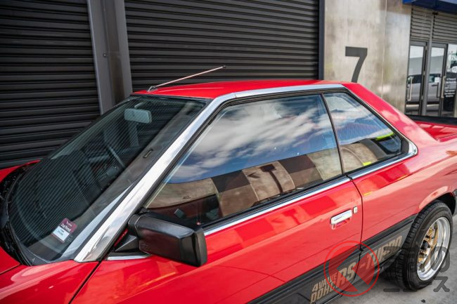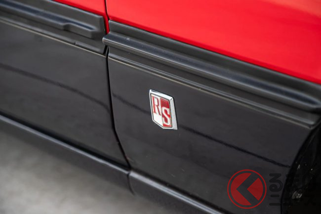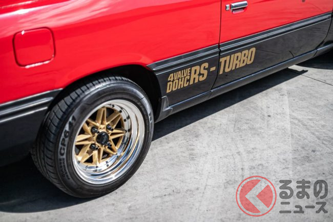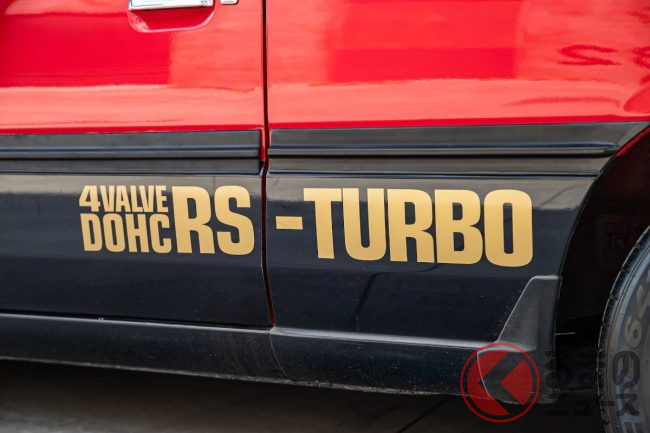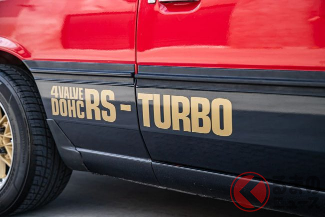 出展車の外装色はレッドとブラックのツートンカラーで、サイドには「4VALVE DOHC RS-TURBO」と書かれたデカールが貼られています。