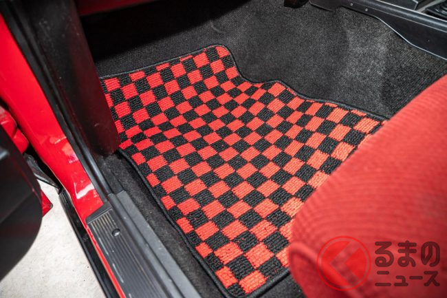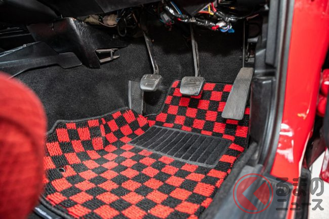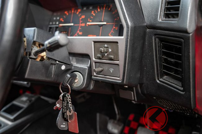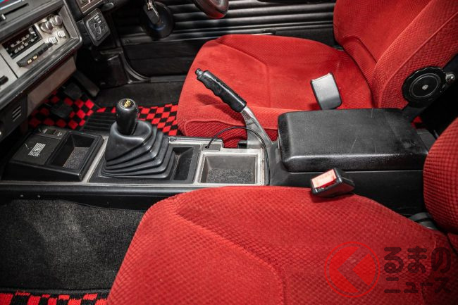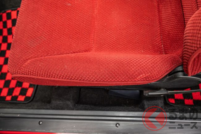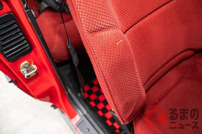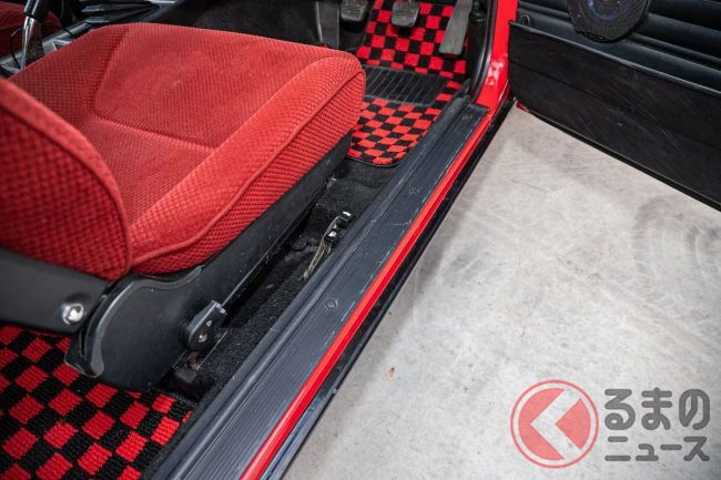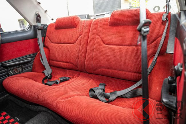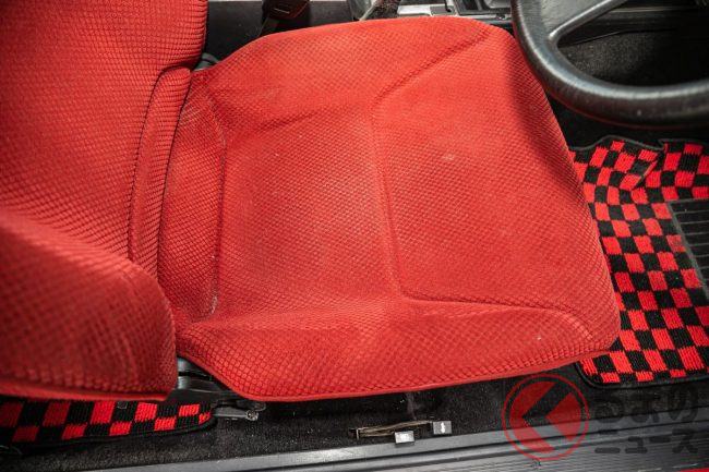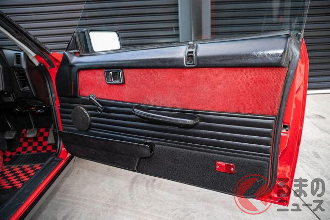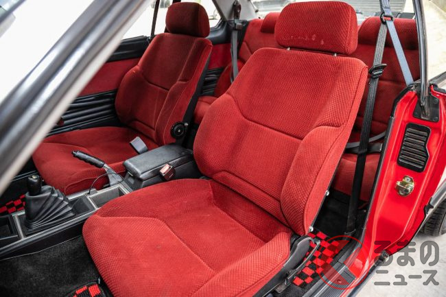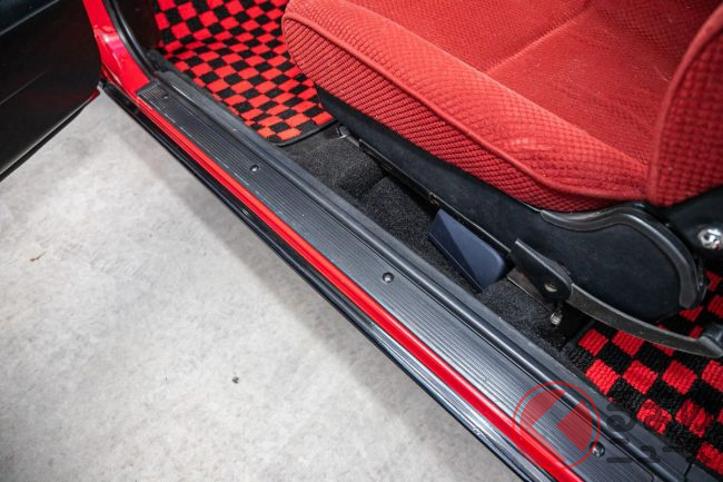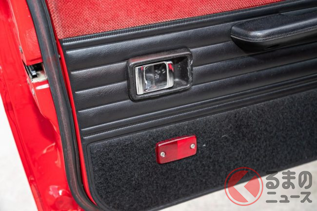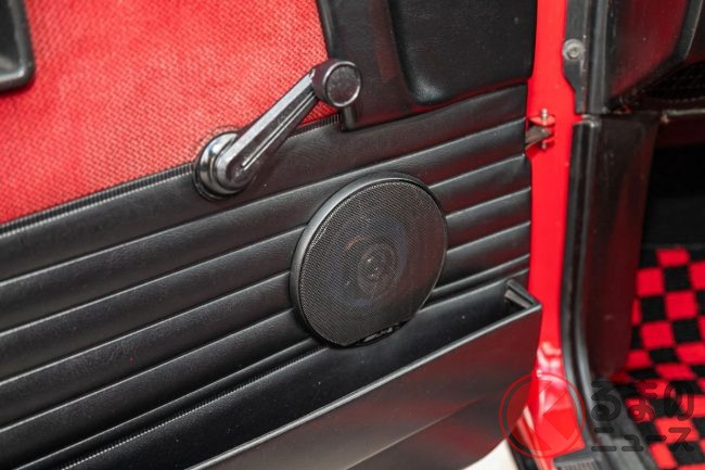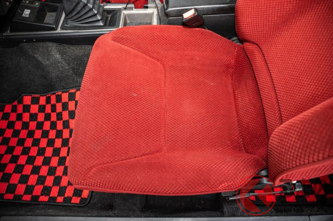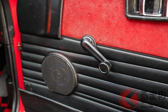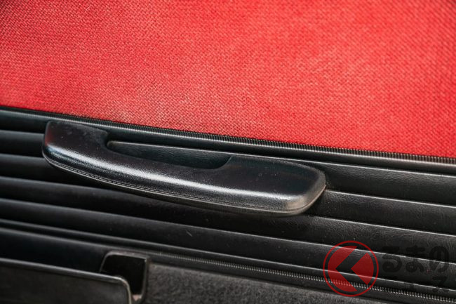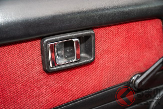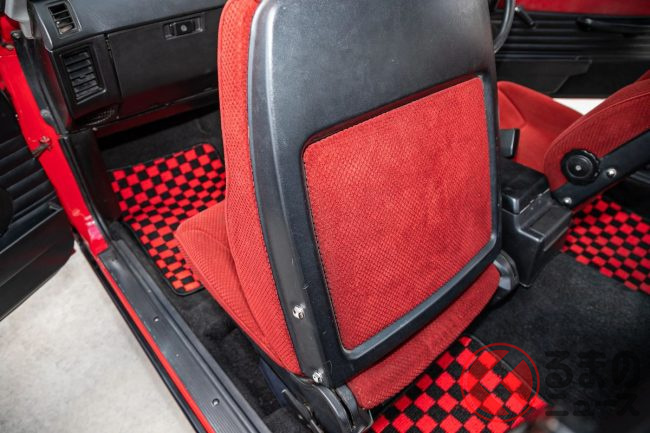内装も外装同様レッドとブラックのファブリックで仕上げられており、フロアマットの赤黒チェック柄が目を惹きます。インパネ各所のパーツもとてもきれいな状態で、今では懐かしい手動式のウィンドウレギュレーターがこのクルマの年式を語ります。