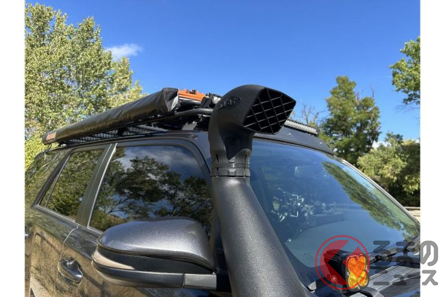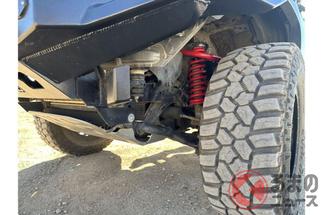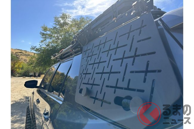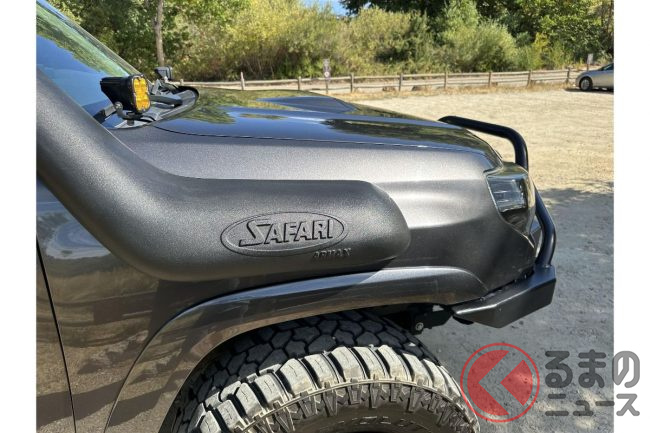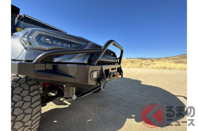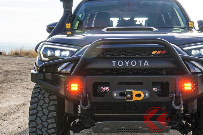 Hefty Fabworks社製アルミニウムフロントバンパーやWARNVR EVO社製ウインチ、ARB Safari社製シュノーケルインテーク、GOBI Stealth社製ルーフラック、RIGd UltraSwing社製ヒッチキャリア、TRDのフロントスキッドプレートなどが装備されるほか、Toytecリフトアップキットにより最低地上高が高められ、走破性能が高められるとともにタフ感を増しています。