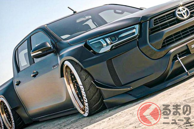 トヨタ「ハイラックス」を6輪化!? “ド派手な”ワイドフェンダー&シャコタン仕様が意外とマッチ!どこにも行けない”カスタム仕様”CGが公開