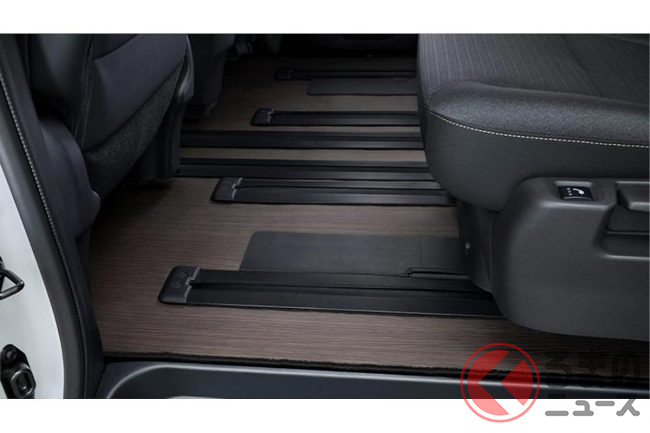 内装のアイテムでは、アクティブなアクセサリーも用意。1列目は質感の高いカーペット、2列目/3列目はアウトドアの汚れをサッと拭き取れるフローリングカーペットを「フロアカーペットフローリングセット」として設定しています。