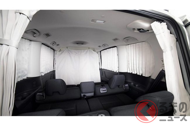 さらに、車中泊などのときに外からの視線を遮り、プライベートな空間を確保する「車内カーテン(フロントカーテン、ウィンドウカーテン一式)」は、スライドドア用は使い手の良い両開き(2分割)タイプとし、フロントカーテンは映像を投影するスクリーンとしても使用可能です。