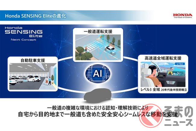 また、ホンダ センシング エリートの次世代技術としては、ホンダ独自のAI技術を活用した認知・理解技術により、従来の高速道路に加え一般道路も含めた自宅から目的地までシームレスな移動を支援する機能を新開発。
