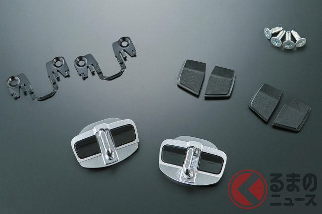 GRドアハンドルプロテクターは、ドアハンドル内側の車体に取り付けるもので、ドア開閉時のひっかき傷を防止する効果があります。パーツはカーボン調で「GR」の刻印があしらわれており、ドアハンドルまわりをスポーティにドレスアップします。