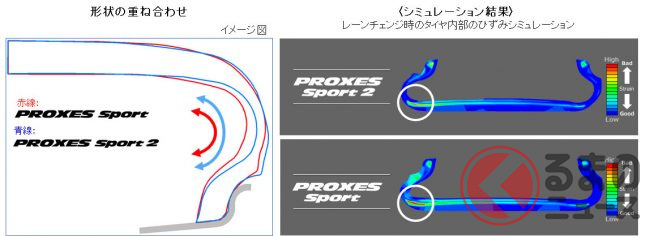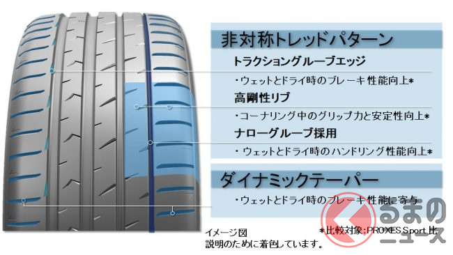 「PROXES Sport 2」はいわゆるスポーツタイヤで、非対称のトレッドパターンとコンパウンドを採用することによって機能の分担を図り、ブレーキ性能とハンドリング性能を効果的に向上させたといいます。