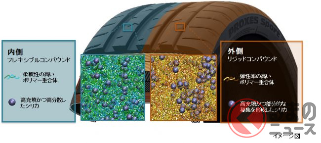 トレッド部の内側のコンパウンドには、ゴムの柔軟性に寄与するシリカを均一に分散し、これにより路面の凹凸にタイヤがしなやかに接地し、ウェット、ドライ双方の路面でのグリップ性能が向上したとか。一方で外側のコンパウンドには、シリカの分散を制御することでゴムの剛性を確保したとも。