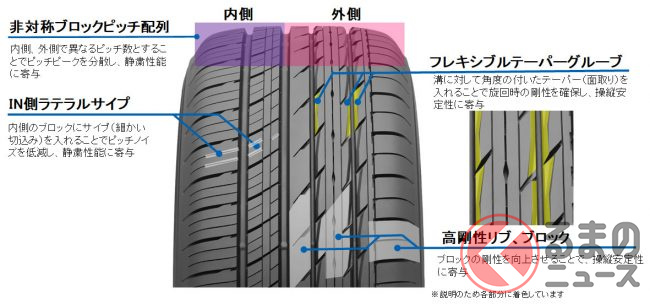 また、トレッド部に配置したブロックの剛性を向上させることにより操縦安定性を向上させ、レーンチェンジの時などにおけるふらつきを抑制し、上質な乗り心地と操縦安定性の両立を図ったそうです。
