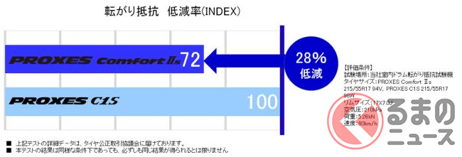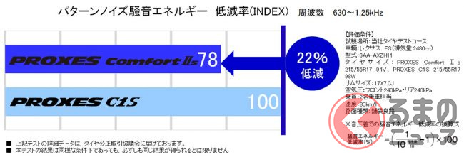 一方の「PROXES Comfort II s」は、タイヤの内側と外側で最適な非対称パターン設計を施すことで、タイヤパターンに起因して発生するノイズの騒音エネルギーを従来品(「PROXES C1S」)比で22%低減、快適な車内空間を提供する高い静粛性を確保したといいます。