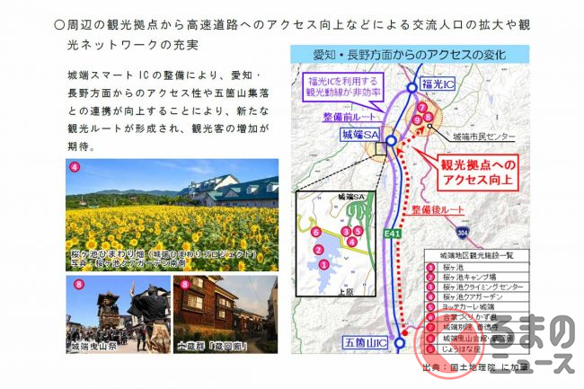 南砺市とNEXCO中日本金沢支社は、同スマートICの整備で東海北陸道へのアクセス機能が強化され、周辺観光拠点へのアクセス向上や地域の防災力強化、救急搬送時間の短縮などが期待されるとしています。