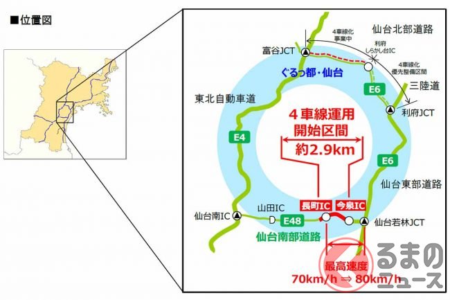 仙台南部道路の今泉IC~長町IC間で4車線運用が開始へ。あわせて仙台若林JCT~長町IC間の最高速度も引き上げられます。