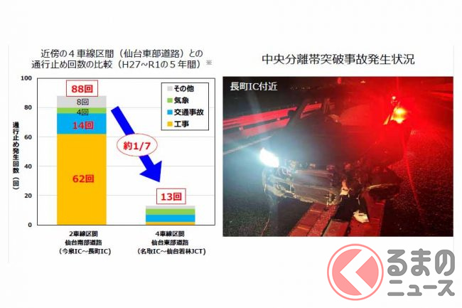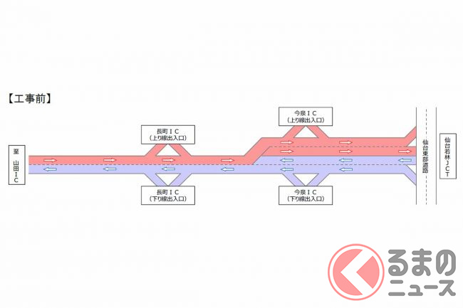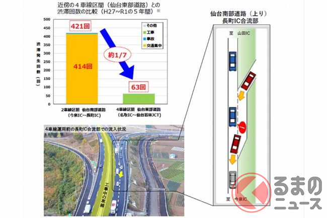 NEXCO東日本東北支社仙台工事事務所によると、今泉IC~長町IC間では、新型コロナ前の2019年までの5年間で交通集中による渋滞が400回以上発生。特に朝に長町IC上り(仙台若林JCT方面)合流部を先頭とする渋滞が発生していたといいます。