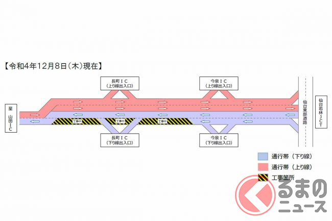 NEXCO東日本東北支社仙台工事事務所は2022年12月8日、仙台南部道路の今泉IC~長町IC間2.9kmが15日から4車線(片側2車線)運用になると発表しました。