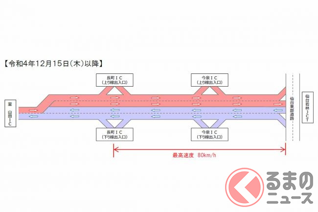 これにあわせて、同路線の仙台若林JCT~長町IC間の最高速度が70km/hから80km/hに変更されます。