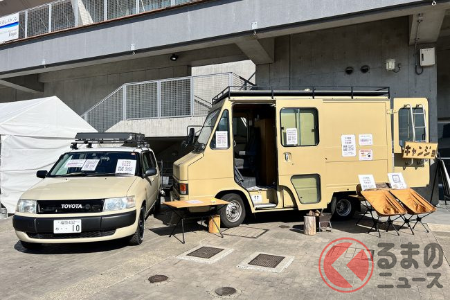 なぜ? キャンプ女子が「動くホテル」を実車展示!? 「TOYOTAロゴ」装着の斬新バン「快適仕様」が凄い? 写真映え間違いないカスタムカーとは