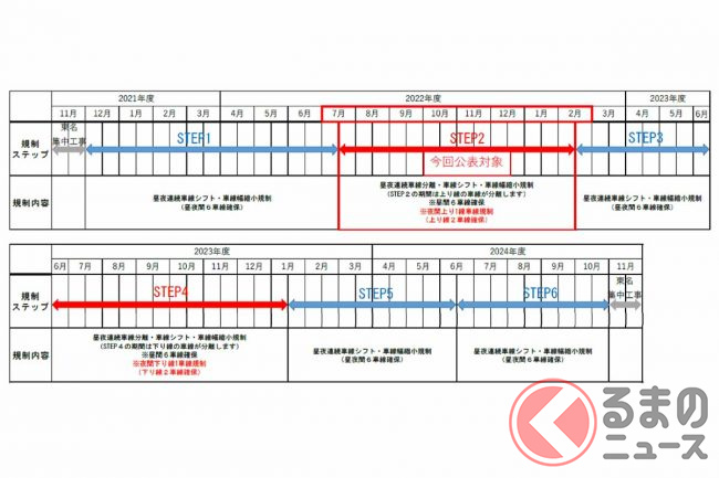 平日夜間の車線規制時は、平均3km程度、最大時は7月の金曜夜に12km程度の渋滞が予測されています。