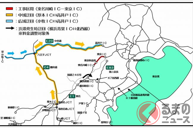 NEXCO中日本は工事期間中、圏央道や中央道、首都高K7横浜北西線などへの迂回を呼び掛けています。