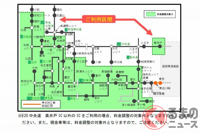 また、ETC車を対象に、厚木IC以西から乗って、圏央道や中央道経由で高井戸ICに降りた場合、東京ICで降りた場合と同じになるよう料金が調整されます(諸条件あり)。