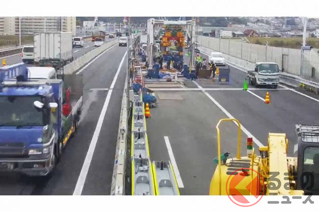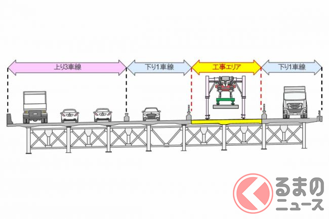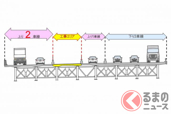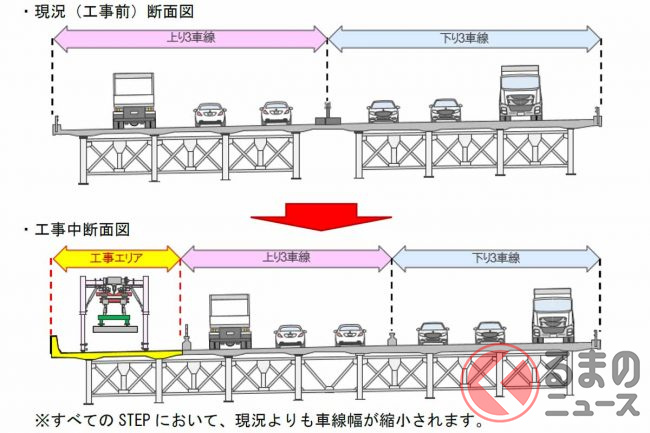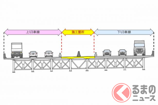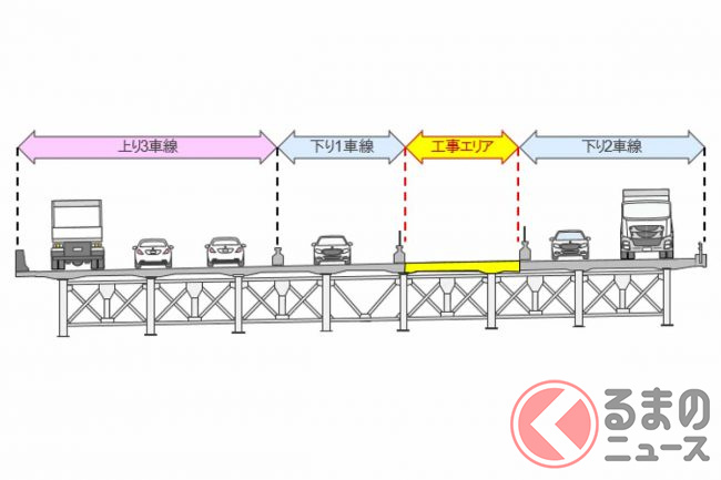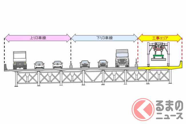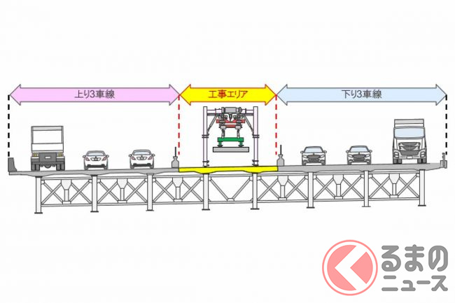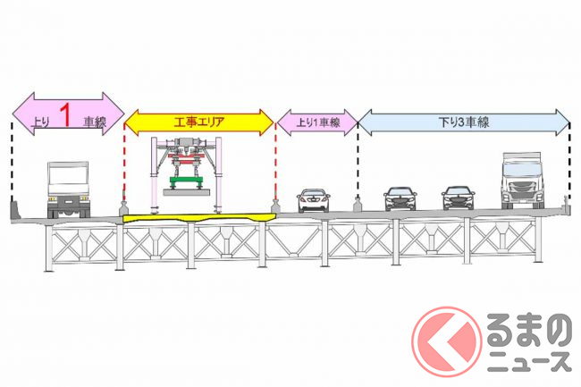 リニューアル工事は2021年11月から始まっており、上下6車線を維持しながら、橋の西側(上り線側)から東側(下り線側)に向かって床版の取り換え工事を段階的に進めています。