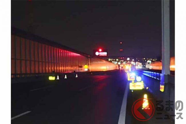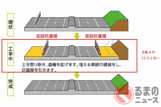 工事期間中は、幅員減少のほか、路肩部分に仮設防護柵を連続して設置するため路肩も狭くなります。また、交通状況に応じて、平日夜間に車線規制も実施されるため注意が必要です。