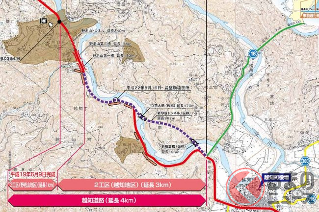 土佐国道事務所は、越知道路の整備で事前通行規制区間が短縮され、防災危険箇所が回避されるとしています。