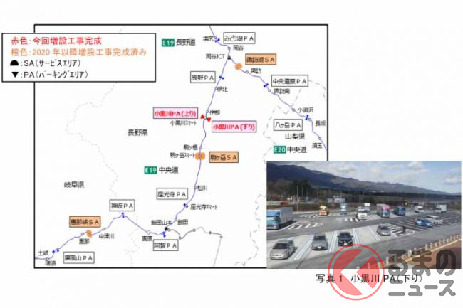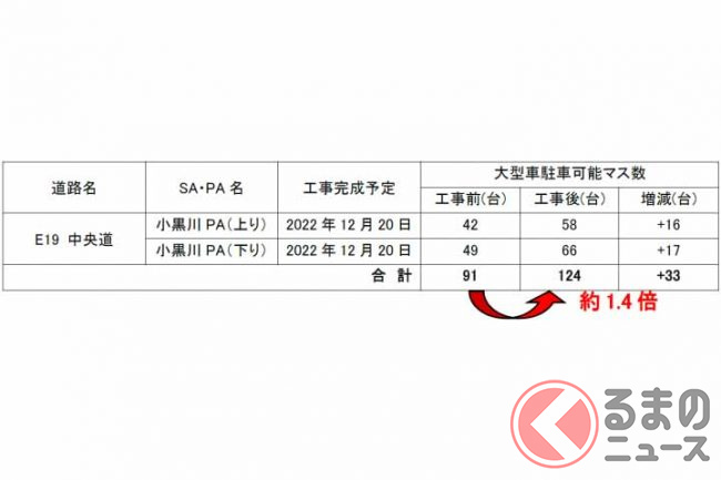 NEXCO中日本名古屋支社は2022年12月14日、中央道上下線の小黒川PA(長野県伊那市)で進めてきた駐車マス増設工事が20日に完成すると発表しました。